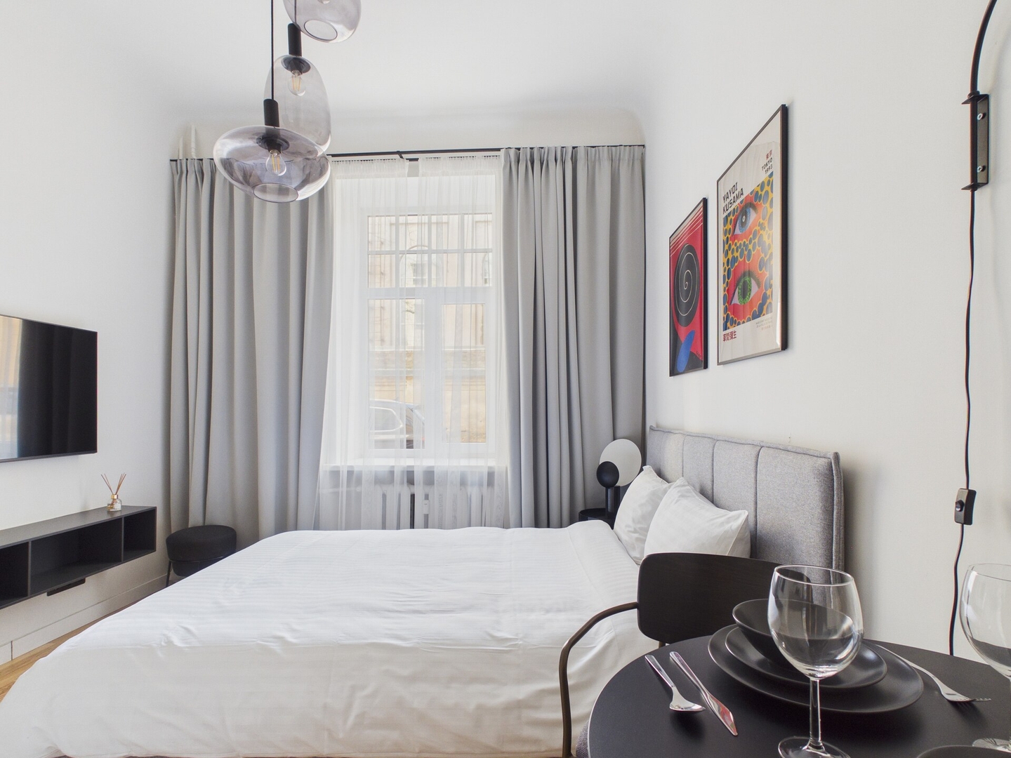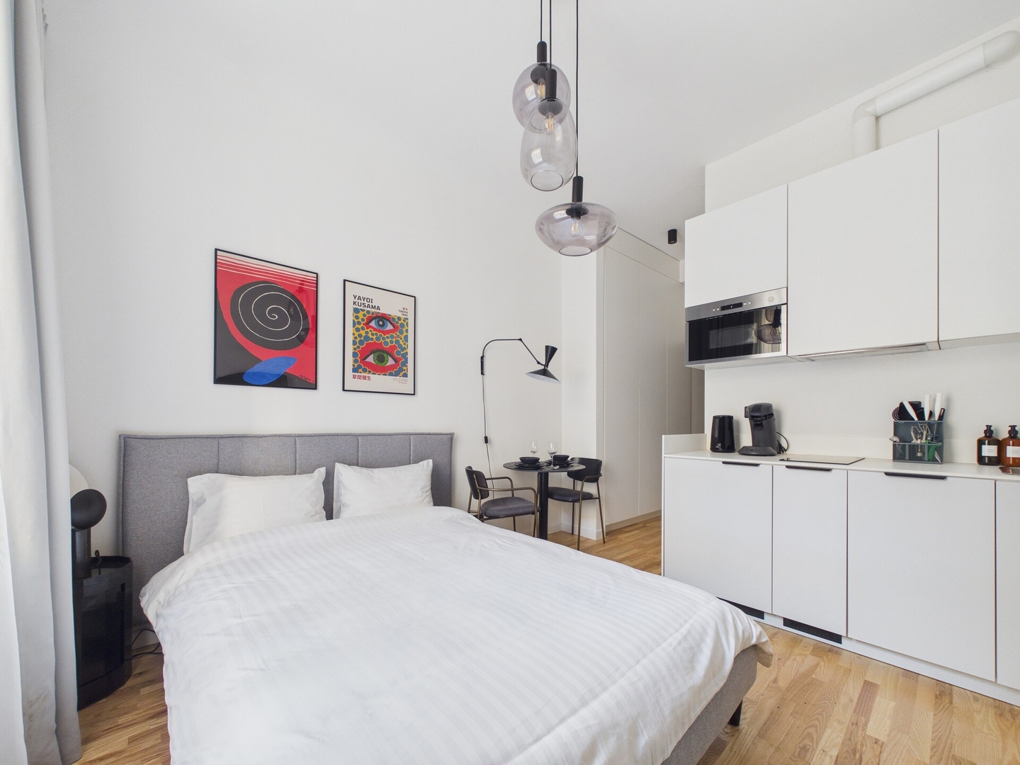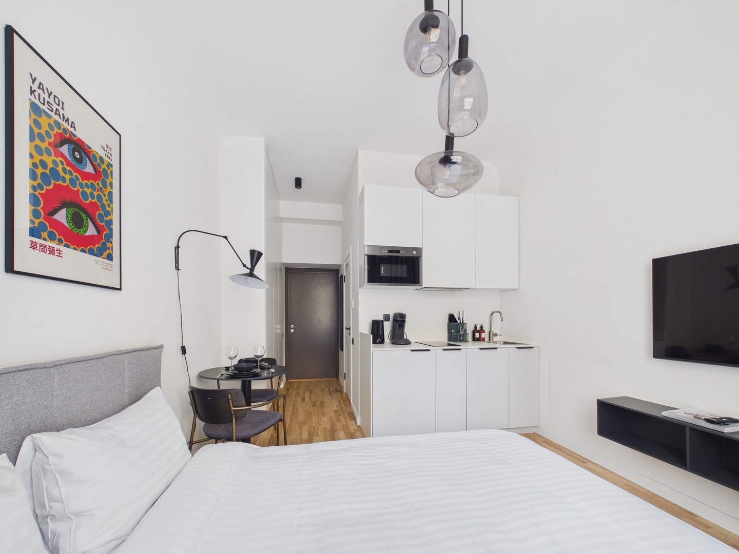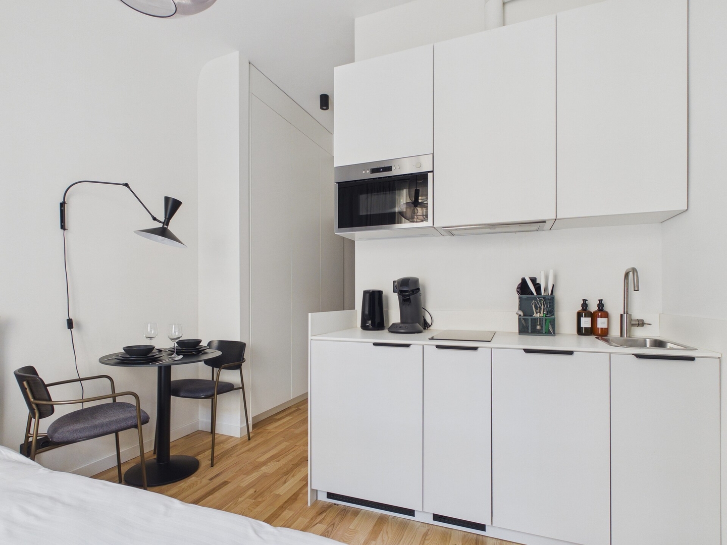 The studio is small but efficiently arranged to include everything needed for a comfortable stay. The living area has a queen size bed (160x200cm), Smart TV, and Wi-Fi. A small dining table provides a place to eat or work. The kitchen is equipped with an induction stove, microwave, fridge, electric kettle, Philips Senseo coffee machine, dishes, cutlery, and basic cooking utensils.
